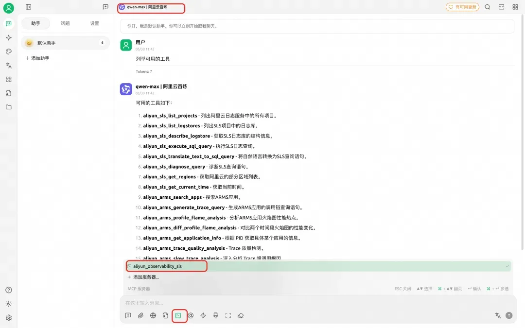 2、在对话框中选择已配置好的 MCP 服务器,并选择一个模型(推荐使用阿里云百炼)。这样,您就可以利用 MCP 服务器来分析 SLS 中的日志。如果向模型询问工具后列出了阿里云 SLS 工具,则说明 MCP 服务器配置已成功。