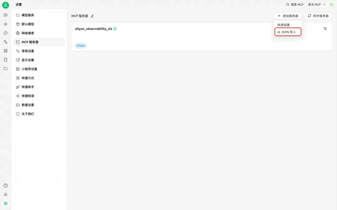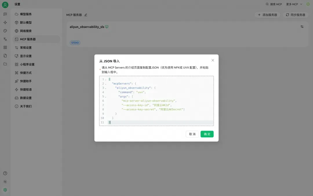 1、如果要以 stdio 模式配置 mcp-server-aliyun-observability,可以在 Cherry Studio 中通过“从 JSON 导入”功能完成。