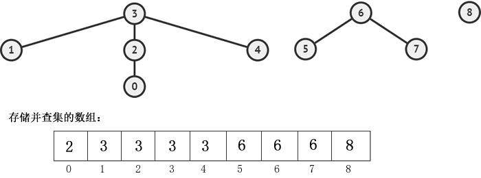 存储{0, 1, 2, 3, 4} {5, 6, 7} {8}的并查集如下图所示: