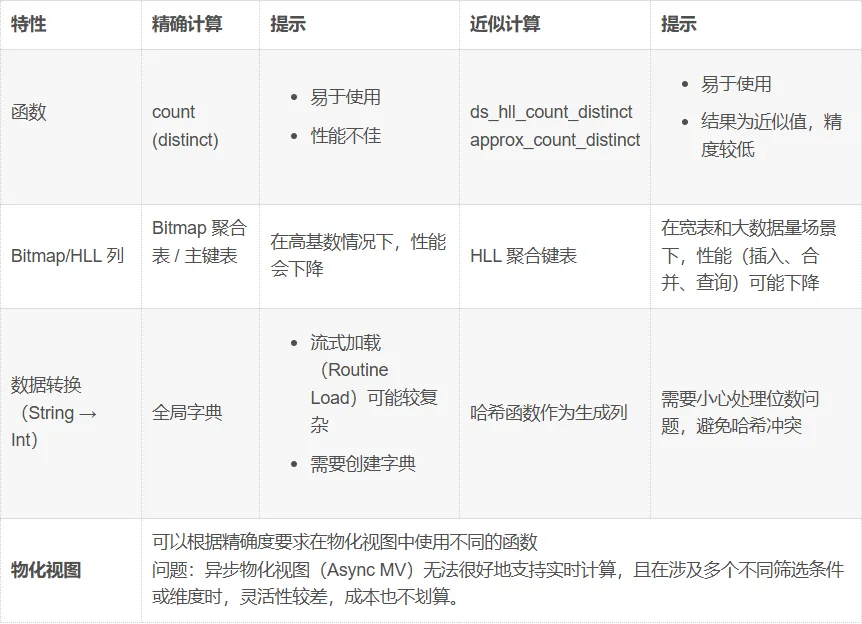 - 如可接受近似去重,则可根据数据特点与精度要求,选择 bitmap_union(bitmap_hash(column)) 或 hll_union(hll_hash(column))。