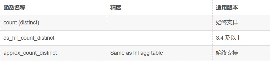 - 如需精确去重,可使用 array_distinct(array_agg(column)) 保存中间状态;