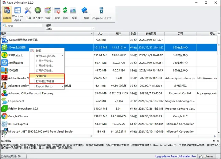 鼠标右键点击这里的软件可以轻松卸载它们,或者轻松找出这些软件的安装位置和注册表中的键值: