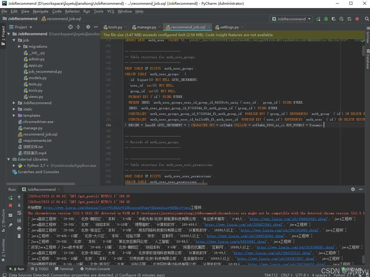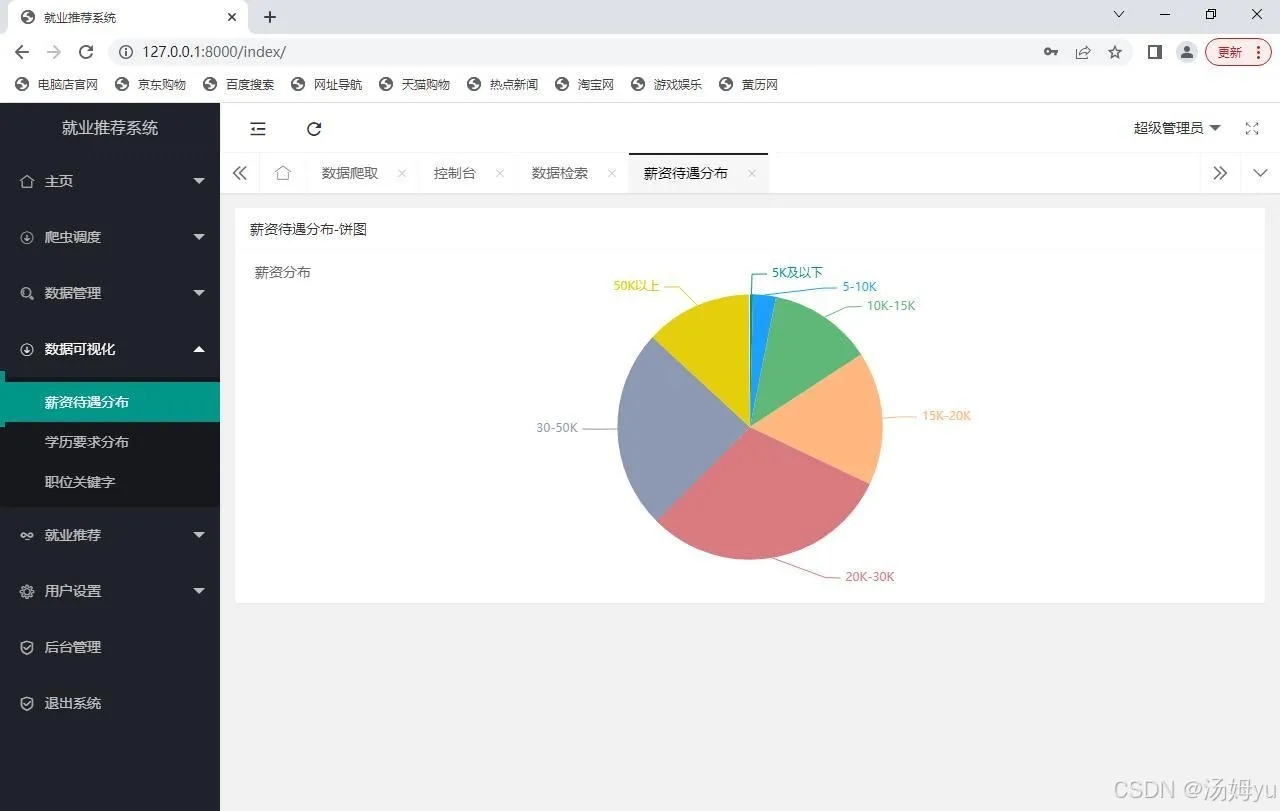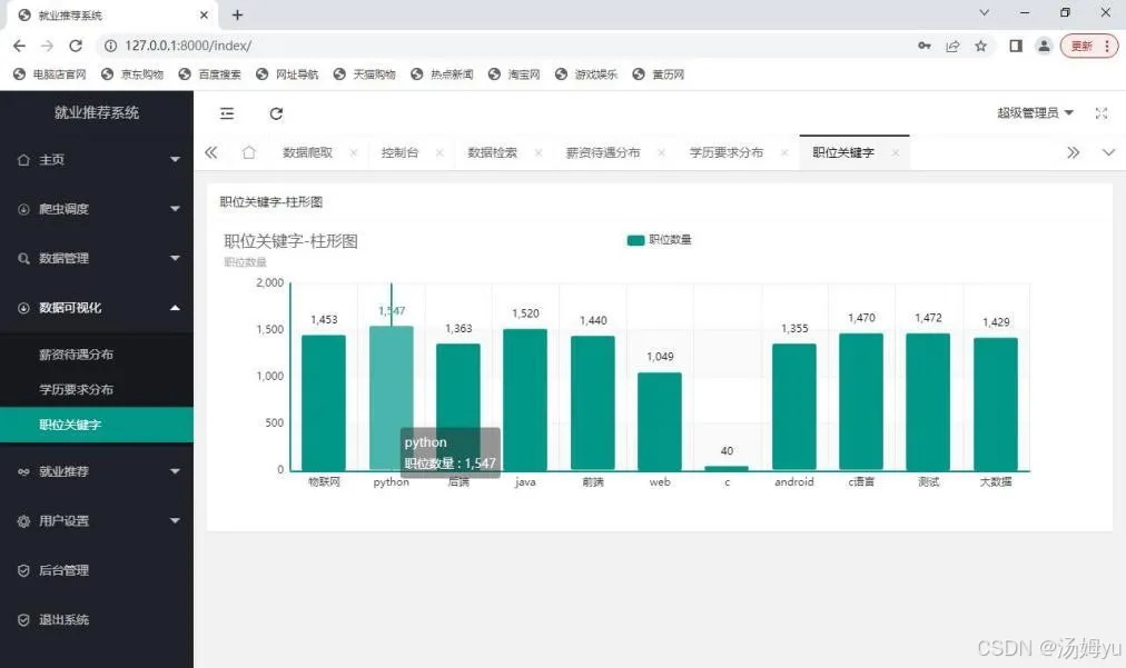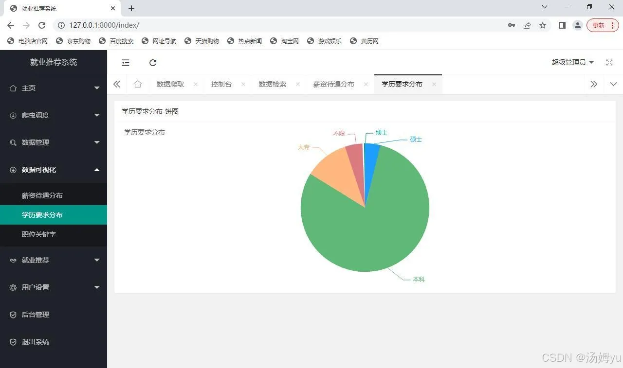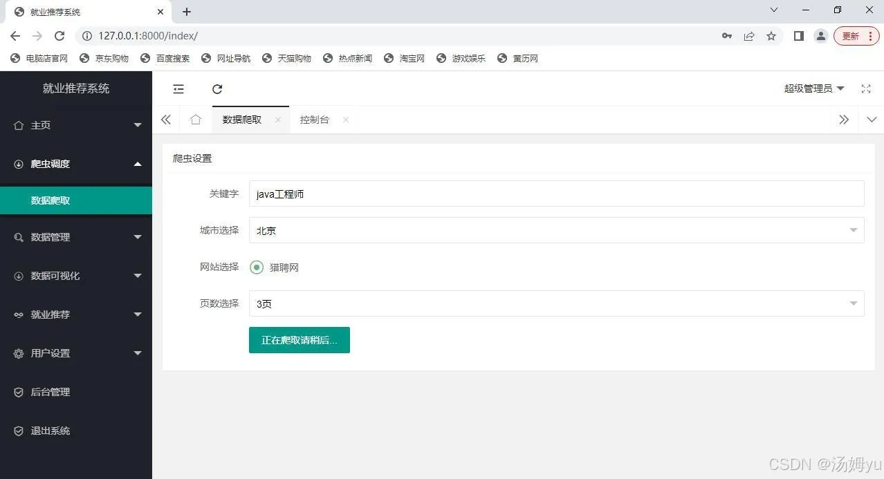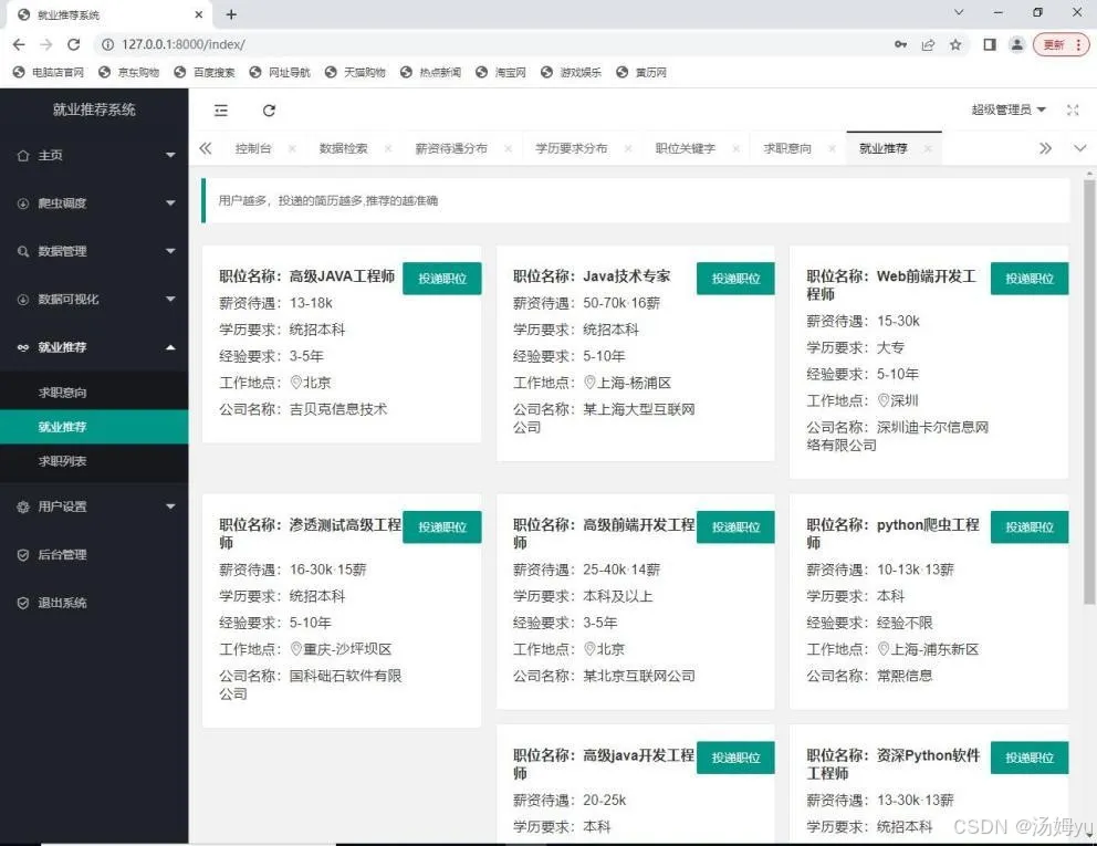 在当今竞争激烈的就业市场,提供个性化的职位推荐对于求职者和雇主都至关重要。基于以上需求,本文设计实现了基于协同过滤的就业推荐系统。协同过滤是一种强大的推荐算法,它依赖于用户和项目之间的相似性,以提供高度个性化的推荐。本文首先将聚焦于用户工作经验、教育背景和工作兴趣等方面的数据进行采集收集和分析,以创建个性化的用户画像。然后对职位的描述、要求、职位特征等信息的处理,以构建推荐职位模型。接着,研究将关注协同过滤算法的选择和实现,包括基于用户的协同过滤、物品协同过滤和混合协同过滤方法等,以提高匹配建议的准确性和多样性。就业推荐系统使用Python语言编写,后端基于Django的Web应用框架,数据库采用MySQL设计,使用ECharts进行数据可视化显示。数据获取使用Selenium框架进行数据的采集,然后对数据进行分析并且将结果在前台进行可视化的展示。获取的数据解析后存储到数据库。最后,使用的是基于用户的协同过滤算法,设计实现基于协同过滤算法的就业推荐系统,系统功能包括控制台功能、数据爬取、数据管理、数据可视化、就业推荐。此外,用户界面设计也将是研究的一部分,包括用户注册、配置和推荐结果的呈现,以提供更好的用户体验。通过以上研究,就业推荐系统将能够更好地满足毕业生用户的就业需求,提高就业市场的效率和用户体验,从而为毕业生求职者和用人单位提供更好的就业支持。