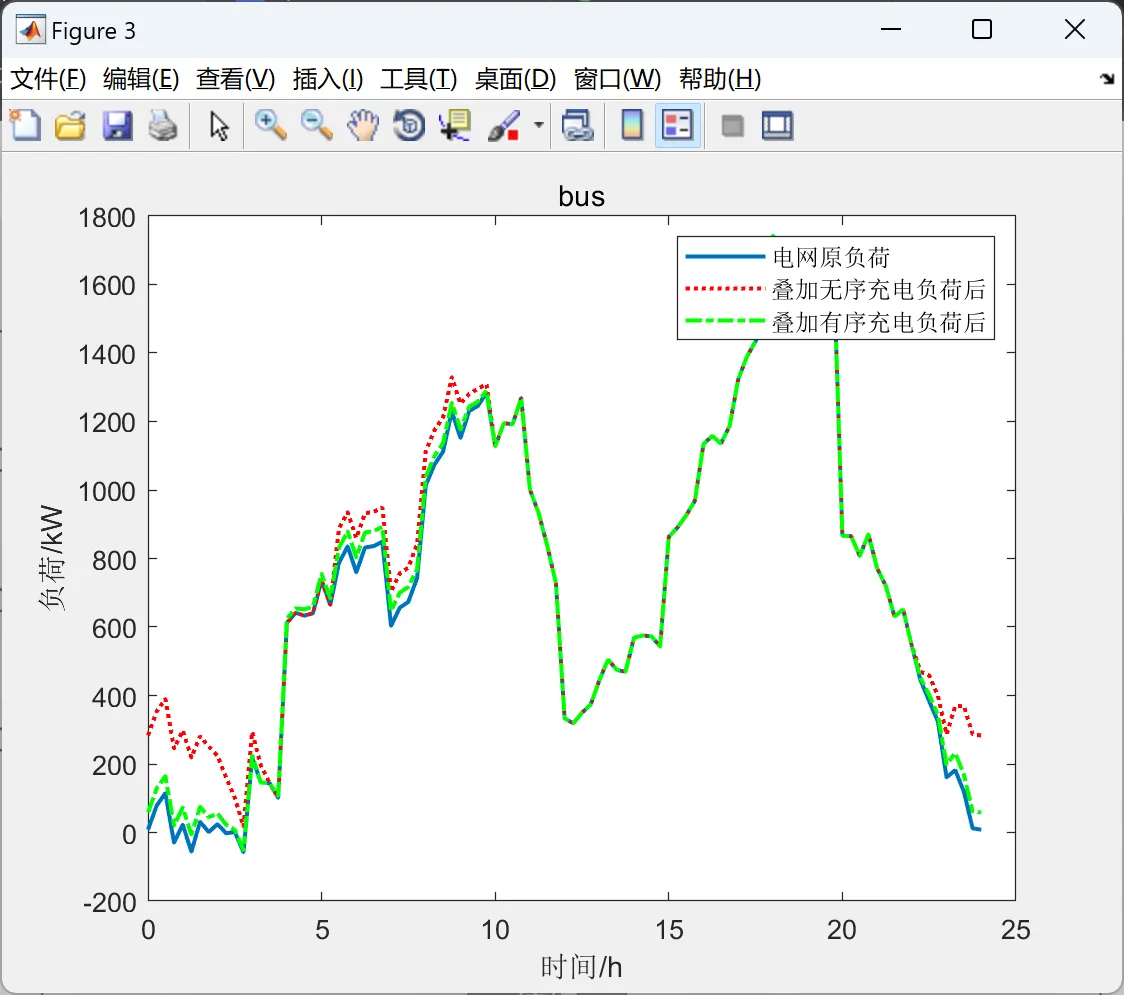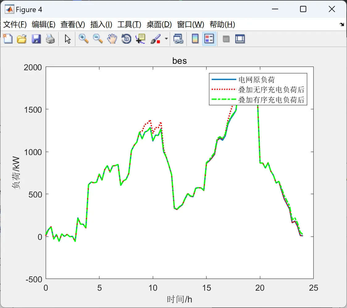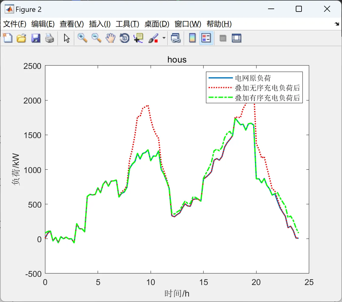 legend('电网原负荷','叠加无序充电负荷后','叠加有序充电负荷后');