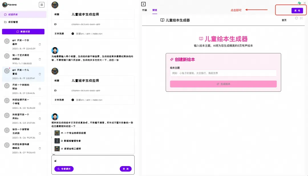 使用“专家模式”,输入框输入“@”选择“资深全栈工程师”。(这里不需要数据库所以不用前面两个智能体。)