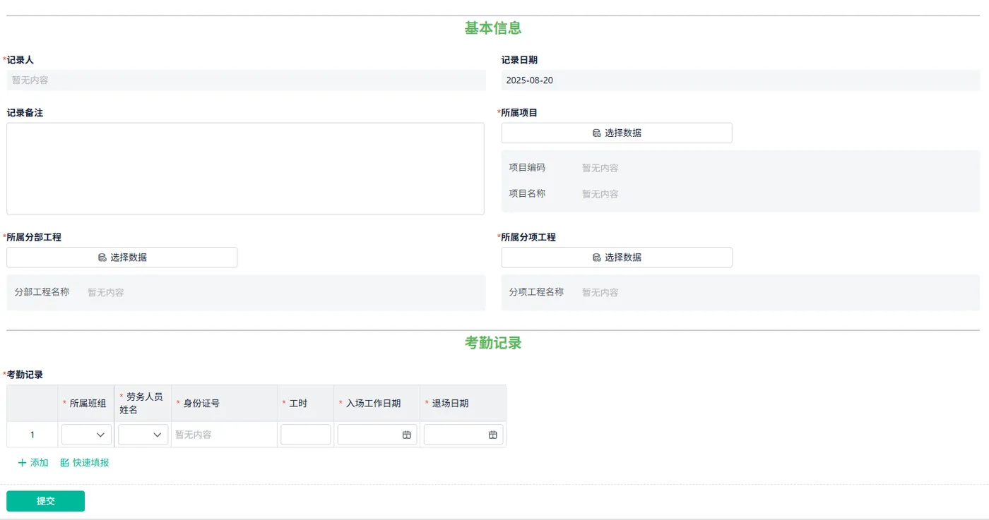 工程项目部管理系统是为了支撑工程项目从人员、物资、进度、成本、质量、安全等维度管理的数字化平台。劳务管理是这套系统的一个重要子系统,负责劳务人员的生命周期管理(入场—在场—离场)、考勤与培训记录、以及导出结算凭证。