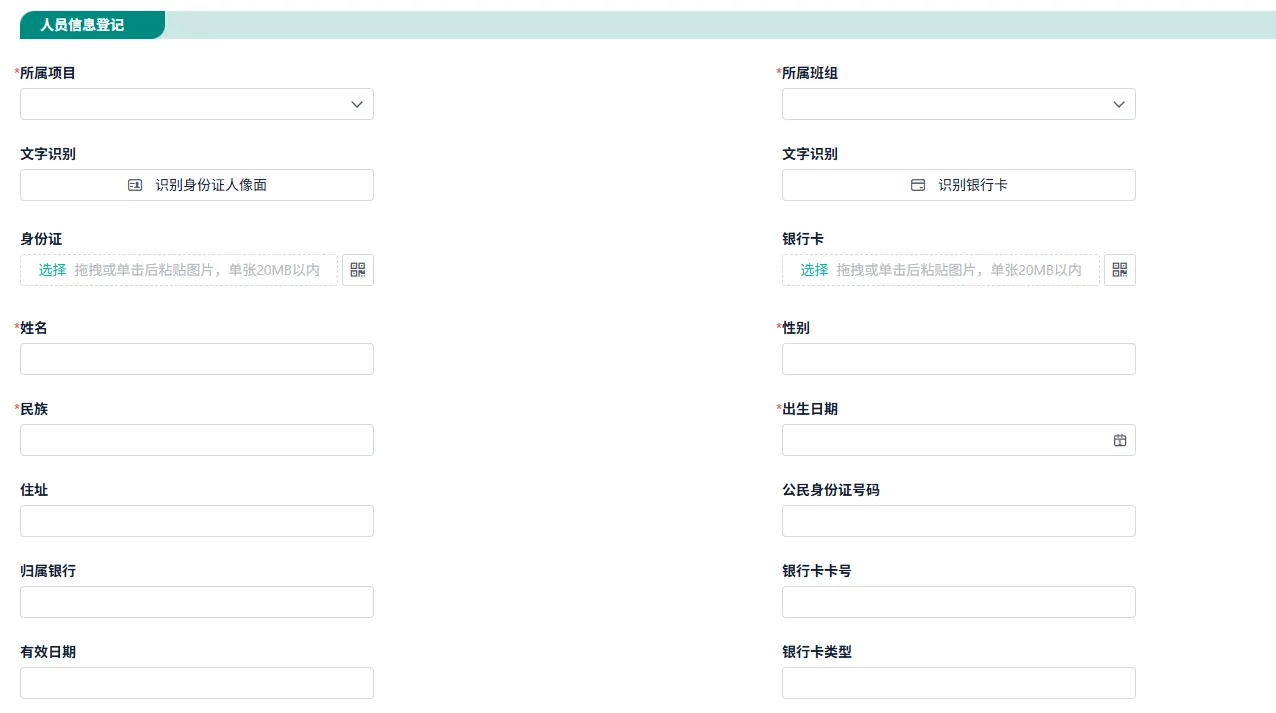 - 劳务人员档案:证件、资质、银行卡、紧急联系人、历史项目经历