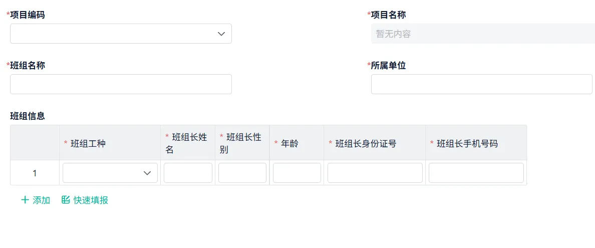 功能:班组创建、班组长绑定、资质文档、成员名额、历史绩效记录。 业务流:班组发起 → 项目部审核资质(身份证、工种证)→ 绑定到具体工段/班次。 开发技巧: