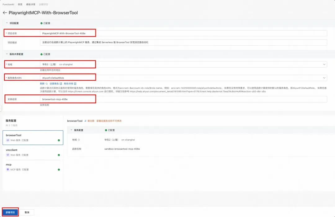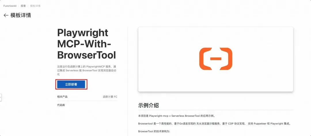 登录阿里云帐号,打开 FunctionAI 中的 Browser Tool Sandbox[1]模板,点击立即部署。