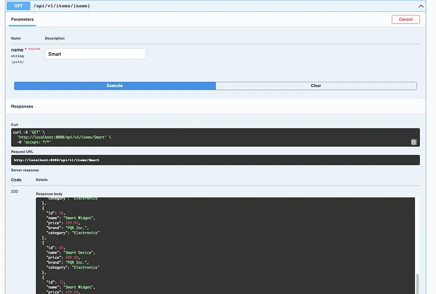- 尝试POST: “ /api/v1/items/{name} ”,使用名称“Smart”进行搜索。您应该会收到一个名称包含“Smart”的项目列表。