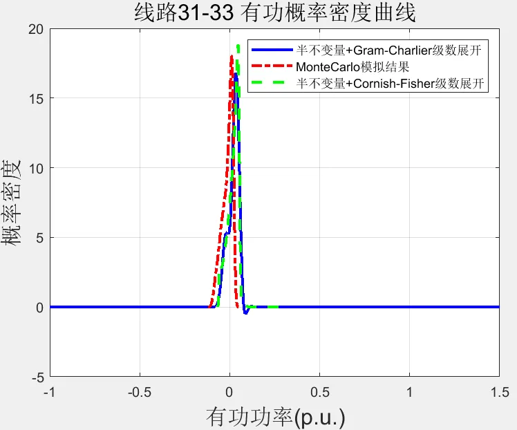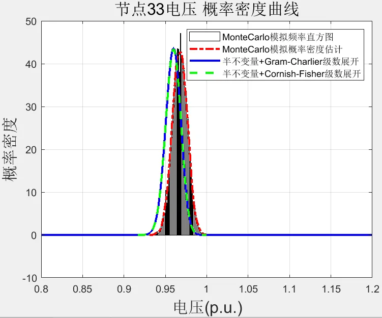 - Gram-Charlier级数展开:生成电压/潮流的PDF,避免负概率问题(采用C型级数修正)。