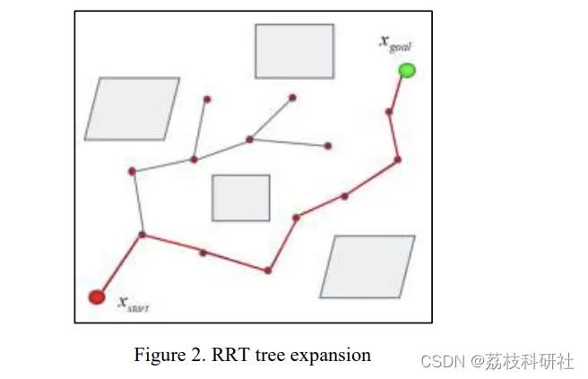 RRT算法生长并维护一棵树,树的每个节点都是工作空间中的一个节点(状态)。算法所探索的区域即为树所占据的区域。算法最初以一棵以起始节点为唯一节点的树开始。在每次迭代时,通过选择一个随机状态并向该状态扩展树来扩展树。扩展是通过将树中距离最近的节点向选定的随机状态扩展一小步来完成的,如图2所示。算法运行,直到某个扩展使树足够靠近目标。