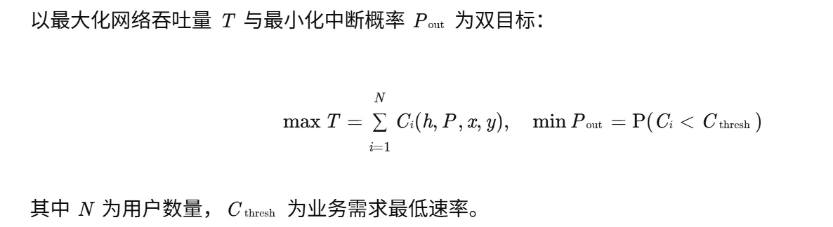 - 吞吐量提升:优化后城市场景吞吐量达120 Mbps(较固定高度方案提升42%),农村场景达35 Mbps(提升38%)。