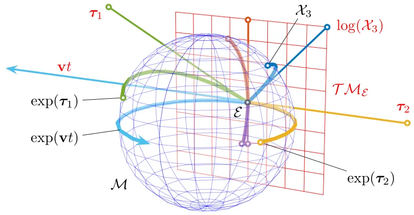 实数是一条直线,但SO(3)不是,它在ℝ³ˣ³里形成一个弯曲的流形。这个流形是连续的、可微的,你可以在上面定义距离。想在这个弯曲的表面上移动,就得沿着切线方向走,这就引出了切空间的概念。