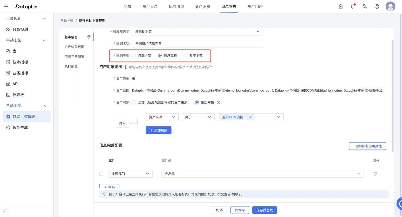 - 首先,我们可以在「资产」-「目录管理」-「自动上架规则」中,为定义明确、可批量配置的属性信息(如来源部门、业务负责人等)配置信息完善规则。
