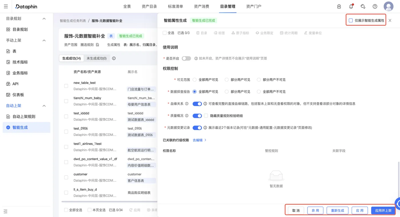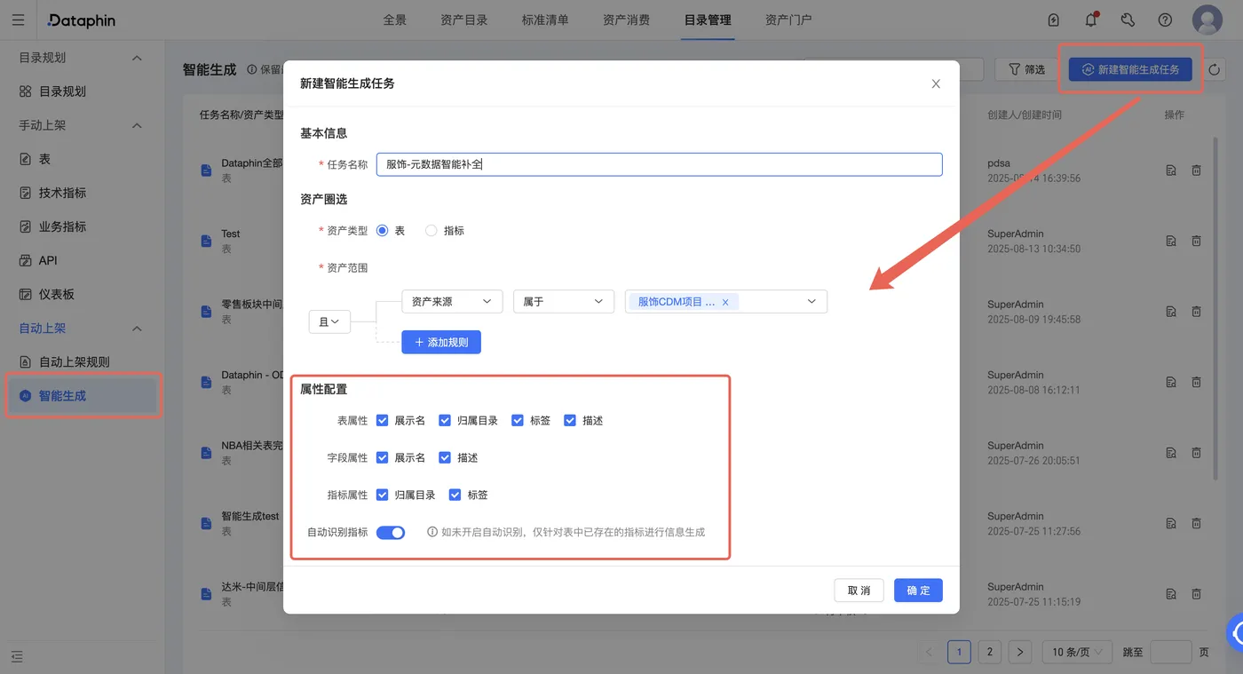 - 接下来,我们在「资产」-「目录管理」-「智能生成」,新建智能生成任务,圈选出需要补全信息的资产,可根据需要选择属性种类。此处的“自动识别指标”若开启,大模型会自动识别出表关联的指标并生成指标基本信息。