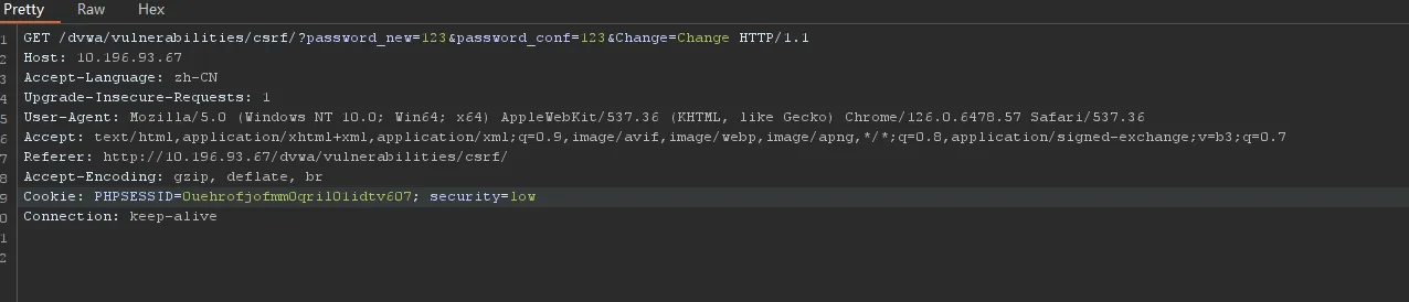 - 使用gordonb用户登录dvwn平台,进入到CSRF模块,输入修改密码框,在点击确认时,使用burp抓包