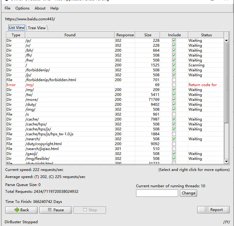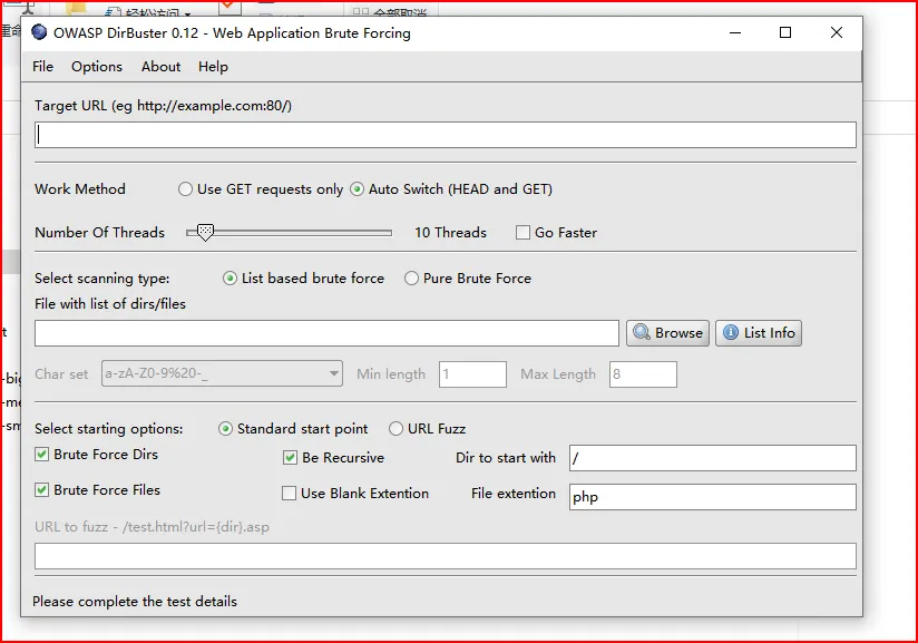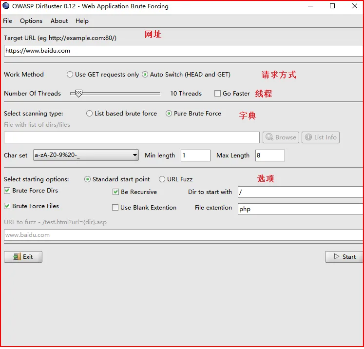 - Dirbuster是一个多线程基因java的应用程序。DirBuster 是一个用于强制目录浏览的渗透测试工具,它主要用于在Web应用程序中识别隐藏的目录和文件