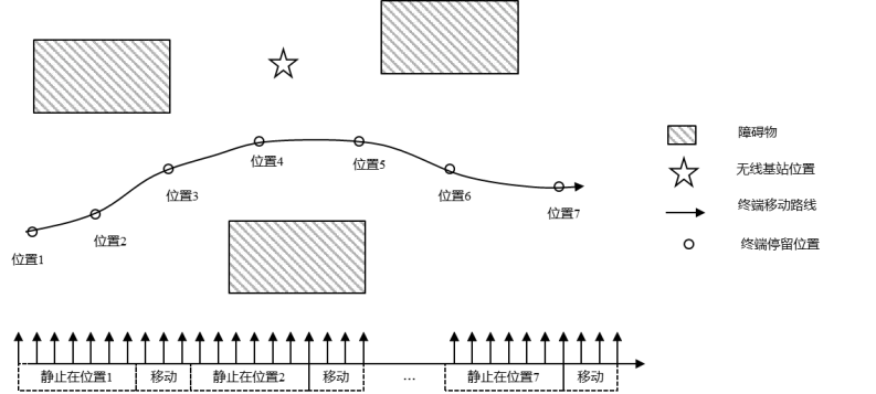 实验数据均由网络设备(即无线基站)在现网环境测试收集,且测试过程中网络设备始终进行数据信息的采集。手机终端从起点(位置1)开始移动,待网络设备采集一段时间的信道信息与链路速率信息后,自动移到下一个目标点位(位置2)保持静止一段时间,之后再移动到新的位置。以此类推,完成所有预设点位上的数据信息收集。