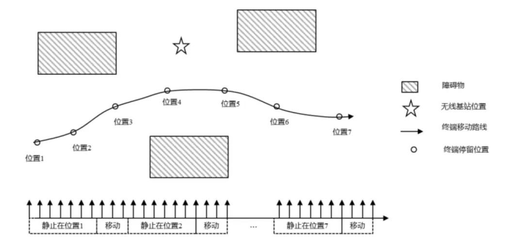 实验数据均由网络设备(即无线基站)在现网环境测试收集,且测试过程中网络设备始终进行数据信息的采集。手机终端从起点(位置1)开始移动,待网络设备采集一段时间的信道信息与链路速率信息后,自动移到下一个目标点位(位置2)保持静止一段时间,之后再移动到新的位置。以此类推,完成所有预设点位上的数据信息收集。