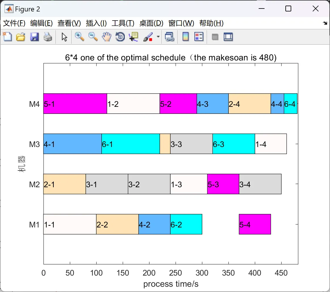 title({[num2str(m),'*',num2str(M),' one of the optimal schedule(the makesoan is ',num2str(best_fit),')']}); %图形名称