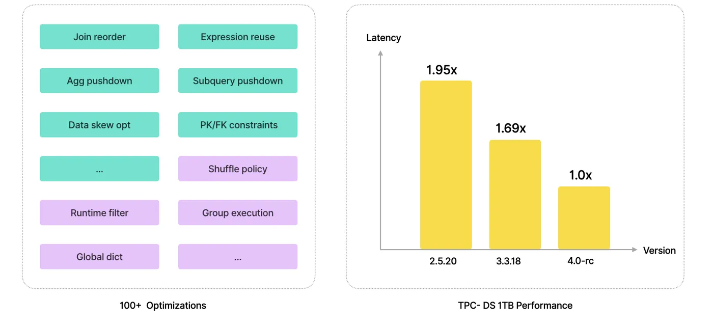 这些优化累计已达数百项,使得 StarRocks 在查询性能上持续进步。以 TPC-DS 1TB 测试为例,从 2.0 到 3.0,再到即将发布的 4.0,StarRocks 的性能指标一直保持稳定提升。