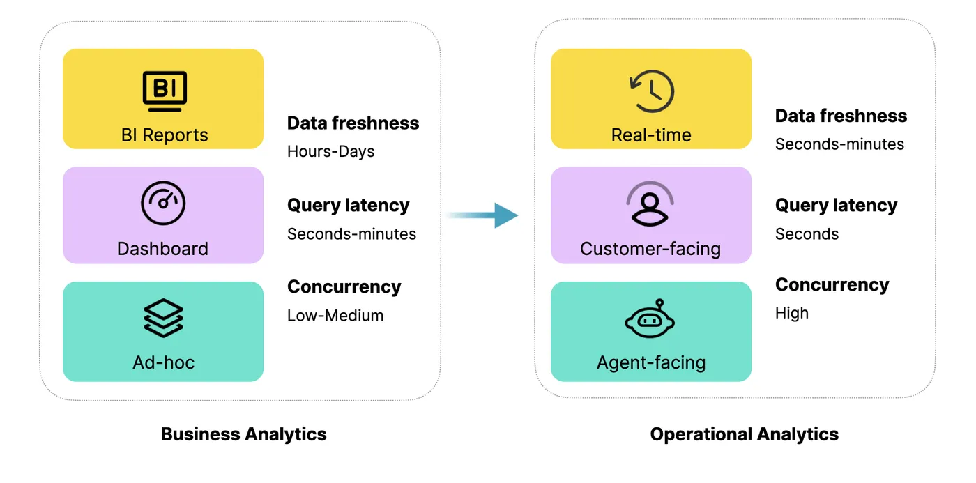 在这两类场景中,对数据分析的要求存在显著差异。以常见的几个核心维度为例:数据新鲜度、查询延时、查询并发。在 Operational Analytics 中,这些要求远高于传统的 Business Analytics。例如,数据新鲜度需要达到秒级或分钟级的实时;面向客户的查询延时必须控制在秒级以内;而在面向 Agent 的场景下,查询并发量更是成倍提升。因此,新的运营分析场景对数据系统提出了前所未有的挑战。
