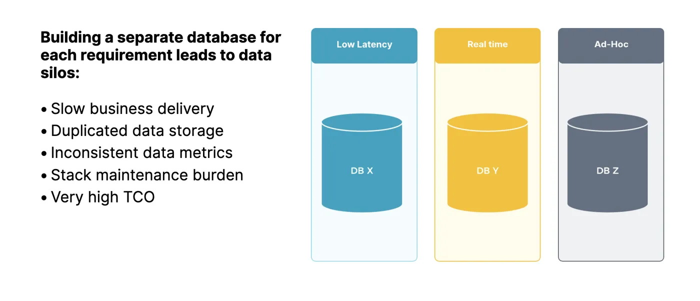北美知名体育电商平台 Fanatics,其数据全部统一存储在 Iceberg 中。但在分析时,需要将数据导入 Redshift、Flink、Druid 等不同系统以支撑各类场景。这种方式不仅造成数据孤岛,难以关联,还带来了高昂的计算与存储成本,且难以满足实时分析需求。