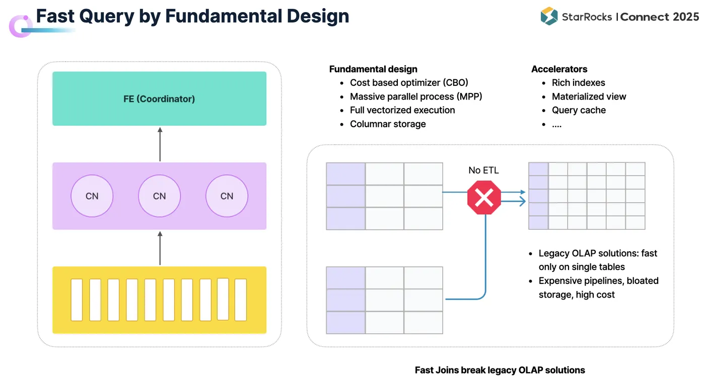 在众多应用场景中,查询延时往往是最核心的指标之一。StarRocks 之所以能够在查询性能上保持优势,主要体现在以下三个方面: