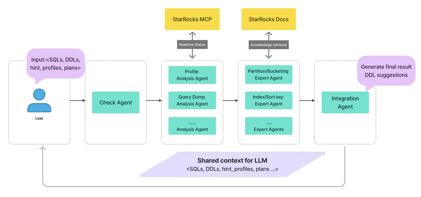 除整条 Multi-Agent 链路外,依托 StarRocks 的 MCP Server,可与 Agent 进行实时的上下文交互。同时,Agent 需要获取 StarRocks 最新文档作为参考,以辅助其决策与分析。