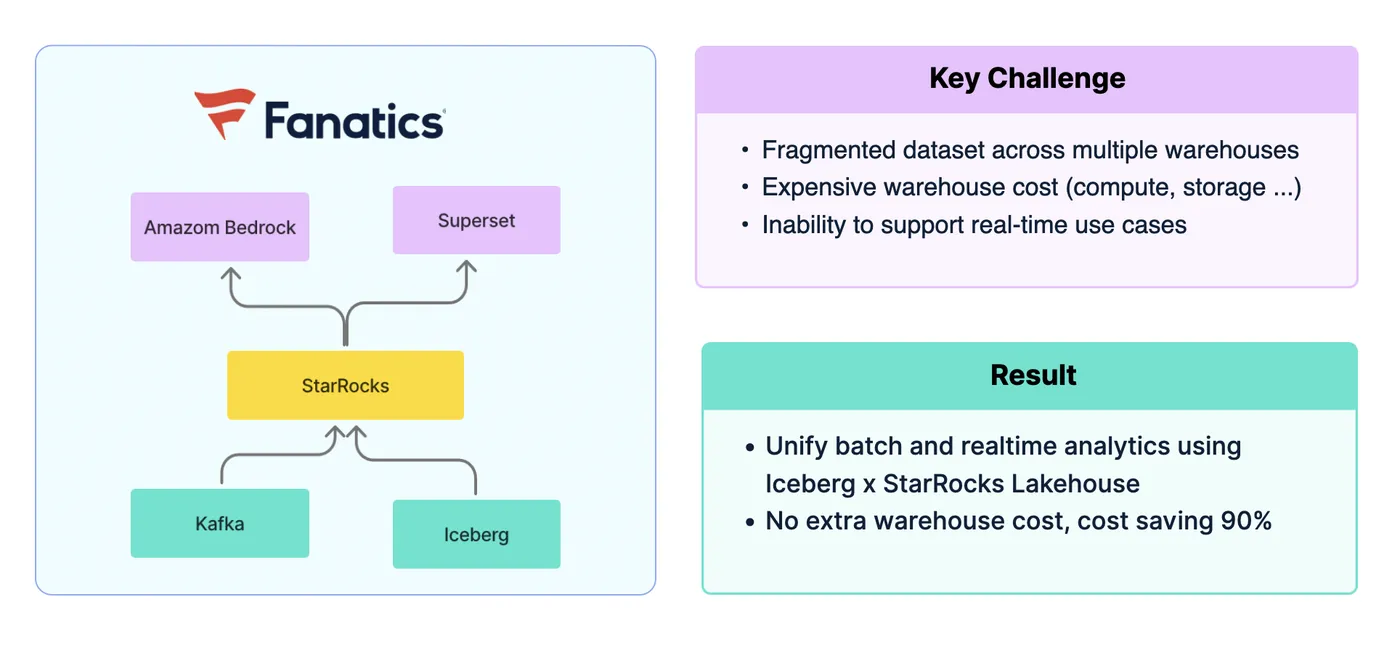 引入 StarRocks 后,Fanatics 构建了统一的湖仓架构:Iceberg 数据在离线场景中可由 StarRocks 直接查询,实时数据则通过 Kafka 导入 StarRocks 即刻分析,并能在同一引擎中实现跨场景关联,支持 BI 与 AI 应用。最终,Fanatics 成功统一了公司数据平台的技术栈,整体成本下降 90%。