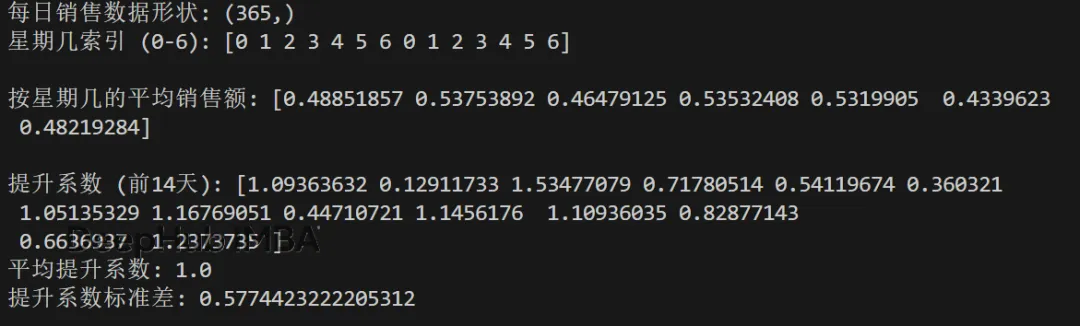 几行代码就能算出每天相对于同星期平均值的"提升系数",不用写任何显式循环。