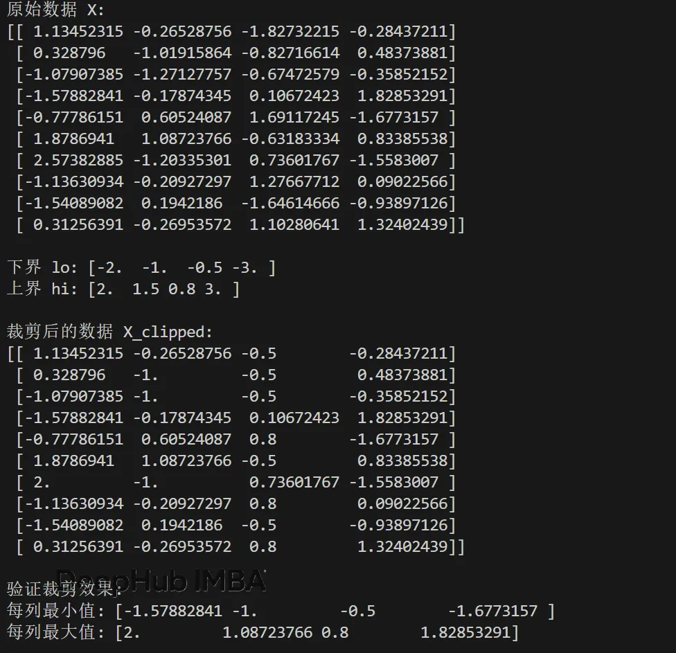 X_clipped=np.minimum(np.maximum(X, lo), hi) # (10,4) vs (4,)