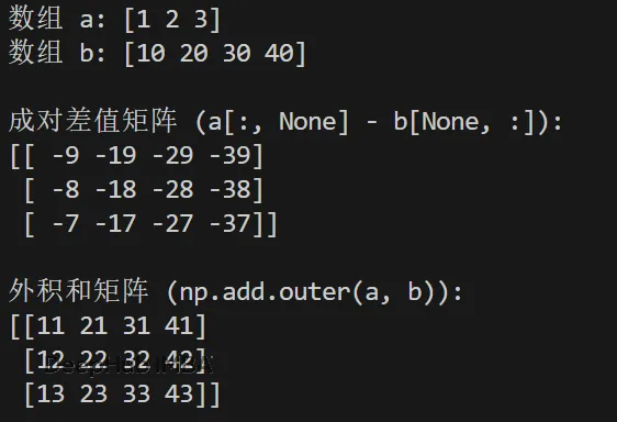 print("\n成对差值矩阵 (a[:, None] - b[None, :]):")