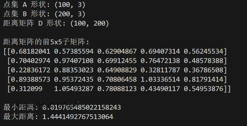 D=np.sqrt(((A[:, None, :] -B[None, :, :]) **2).sum(axis=2))