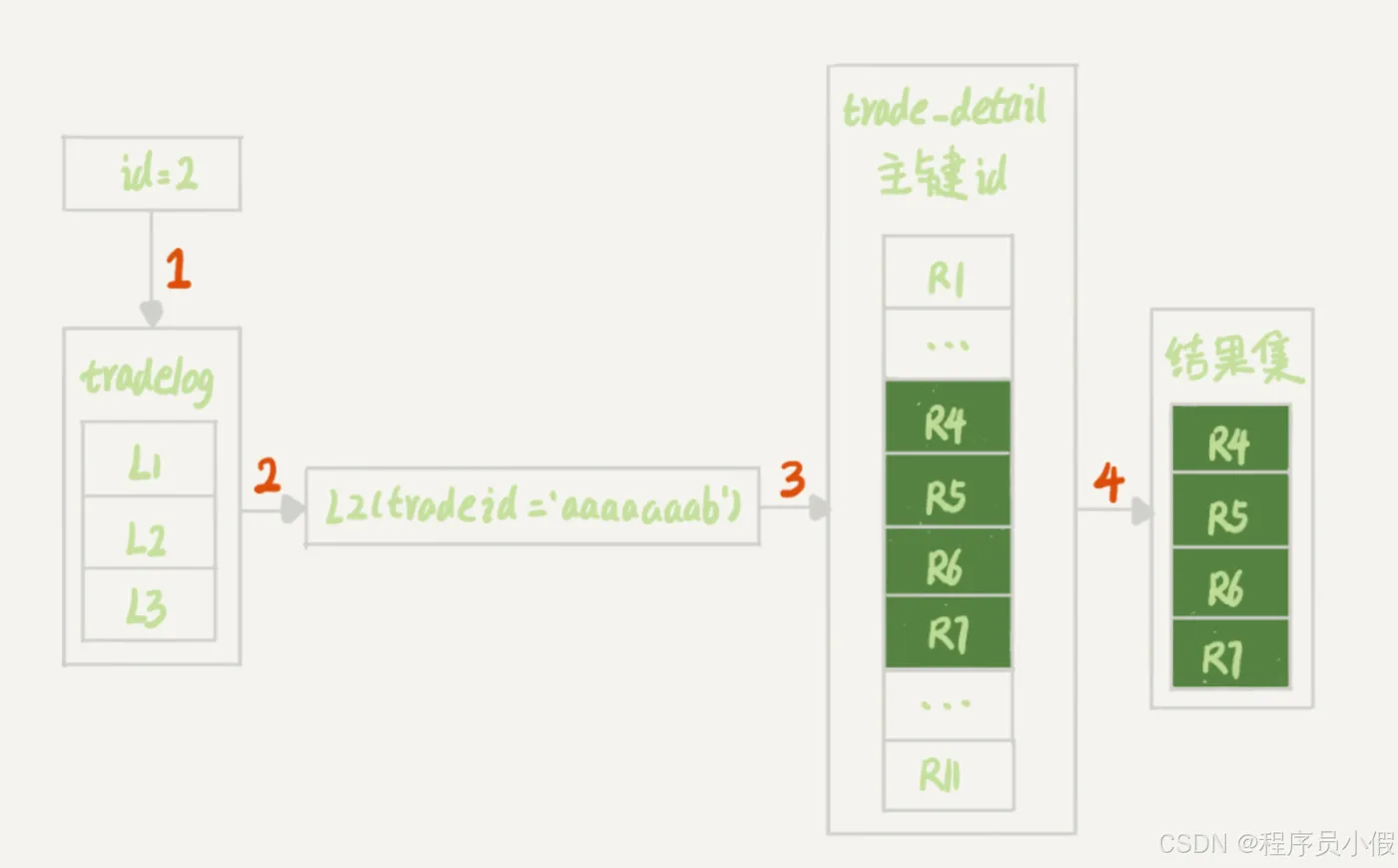 - 第1步,是根据id在tradelog表里找到L2这一行;