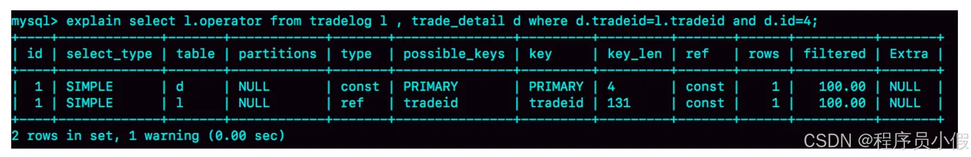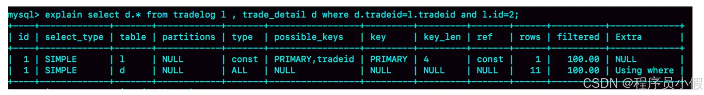 - 第一行显示优化器会先在交易记录表tradelog上查到id=2的行,这个步骤用上了主键索引,rows=1表示只扫描一行;