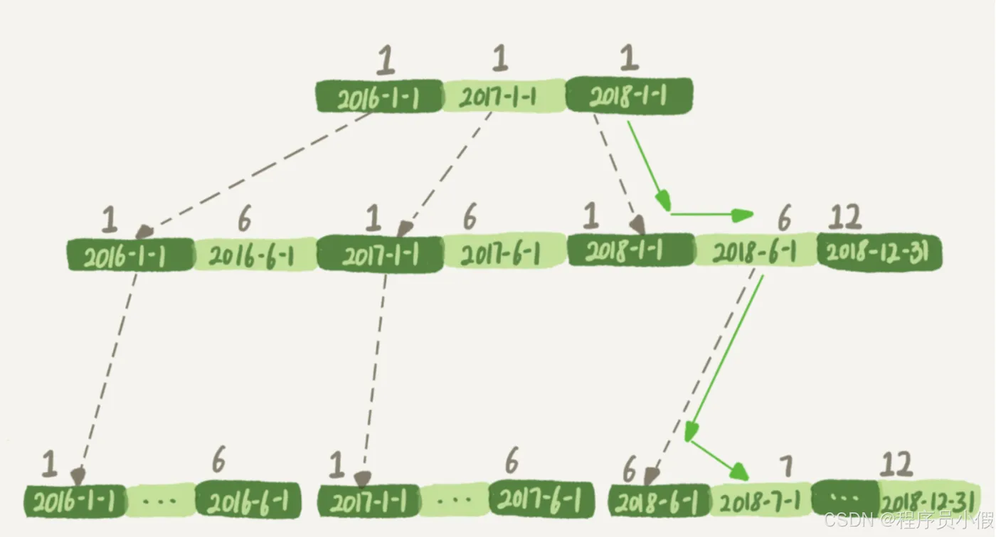 如果你的SQL语句条件用的是where t_modified='2018-7-1’的话,引擎就会按照上面绿色箭头的路线,快速定位到 t_modified='2018-7-1’需要的结果。