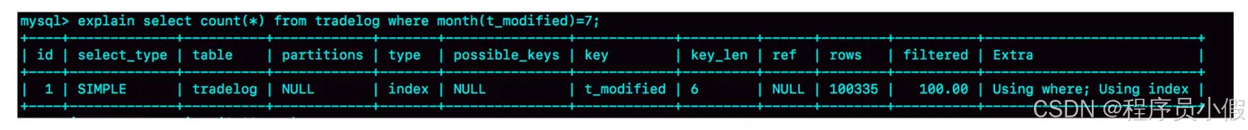 到这里我给你说明了,由于加了month()函数操作,MySQL无法再使用索引快速定位功能,而只能使用全索引扫描。