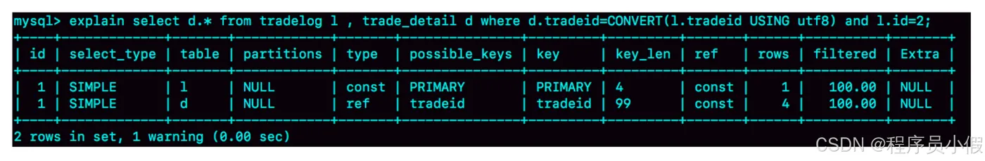 mysql> select d.* from tradelog l , trade_detail d where d.tradeid=CONVERT(l.tradeid USING utf8) and l.id=2;