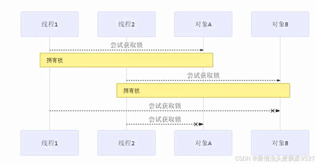 - t2线程获得B对象锁,接下来想获取A对象的锁