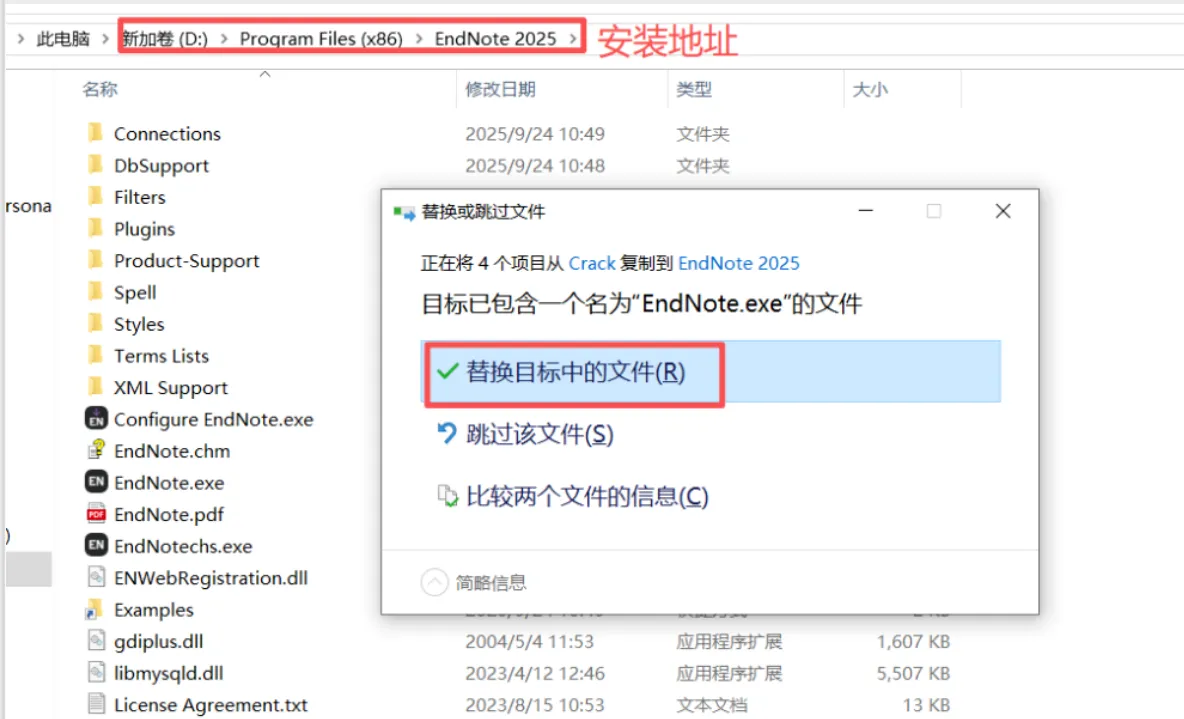 15、打开软件安装地址 (见第9步), 把上面复制的4个文件粘贴在安装地址下,点击替换目标文件。