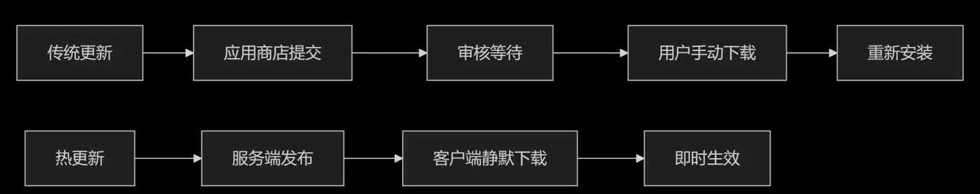热更新(Hot Update)是指在不重新安装整个应用程序的情况下,动态更新部分代码和资源的机制。就像给飞行中的飞机进行”空中加油”,无需迫降就能补充燃料。