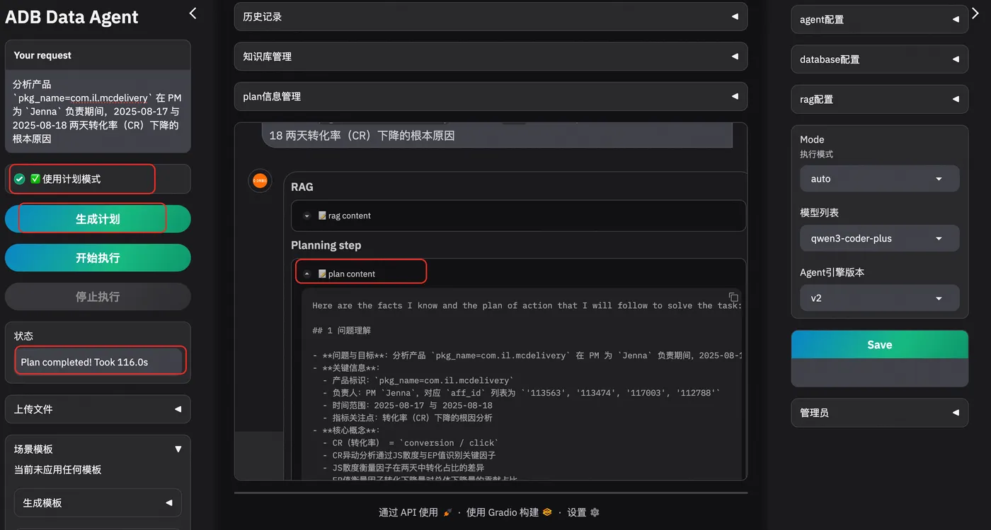 - 场景模版+知识库RAG:结合内部分析平台中沉淀的指标分析方法,通过ADB Agent的场景模版和知识库能力,将各个指标的分析固化,业务分析更高效和准确。