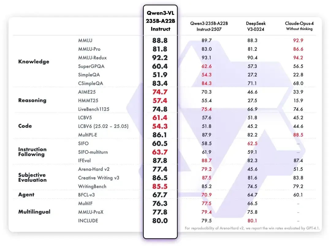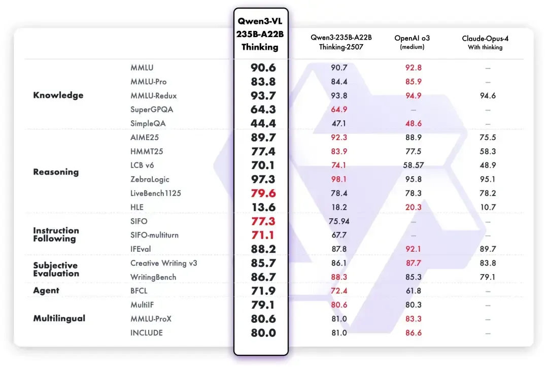 在纯文本任务上,无论是Qwen3-VL-235B-A22B的Instruct和Thinking都表现出强大的性能,与Qwen3-235B-A22B-2507的纯文本模型不相上下。
