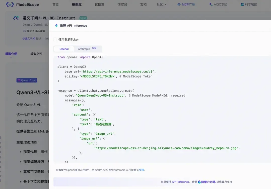ModelScope平台也第一时间上线适配了Qwen3-VL模型的API,开发者可以通过ModelScope的免费API-Inference来直观体验模型的效果。相关实例代码在模型页面右侧(例如https://www.modelscope.cn/models/Qwen/Qwen3-VL-8B-Instruct)即可找到: