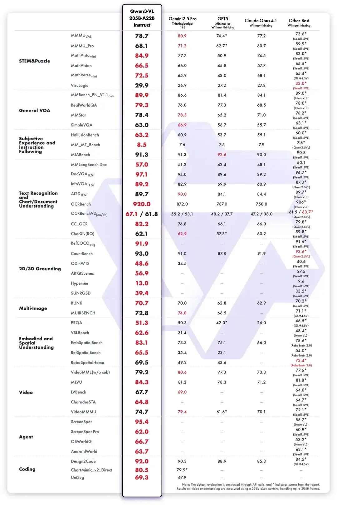 从十个维度全面评估了模型的视觉能力,涵盖综合大学题目、数学与科学推理、逻辑谜题、通用视觉问答、主观体验与指令遵循、多语言文本识别与图表文档解析、二维与三维目标定位、多图理解、具身与空间感知、视频理解、智能体任务执行以及代码生成等方面。整体来看,Qwen3-VL-235B-A22B-Instruct 在非推理类模型中多数指标表现最优,显著超越了 Gemini 2.5 Pro 和 GPT-5 等闭源模型,同时刷新了开源多模态模型的最佳成绩,展现了其在复杂视觉任务中的强大泛化能力与综合性能。