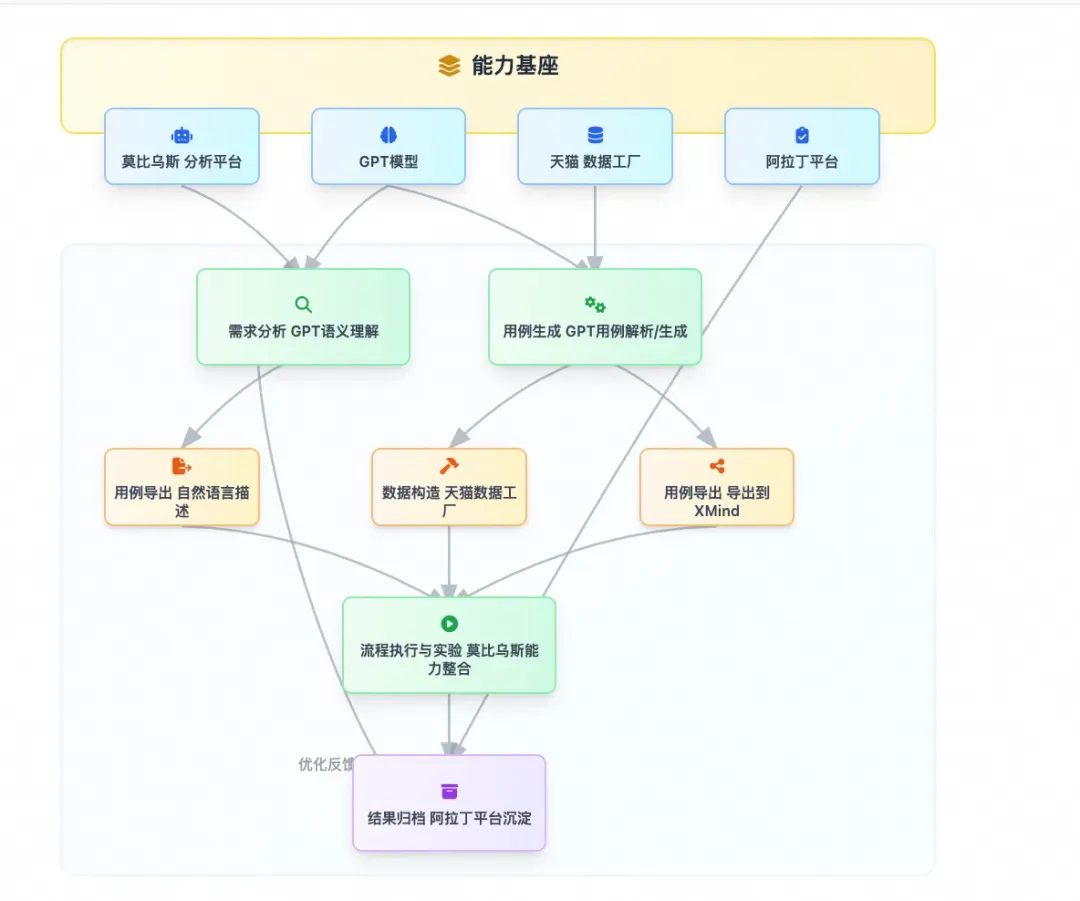 3. 智能流程融合与持续优化:在AI辅助流程半自动化过程中我们发现AI虽然深入参与了需求测试的全流程,但是用例资产无法沉淀、测试数据无法构造等问题限制了后续能力的拓展,所以在第三阶段我们通过多个工程系统对接(用例管理平台、测试数据构造平台、知识库沉淀)实现了真正的数据变为资产、AI全流程驱动的工程化模式