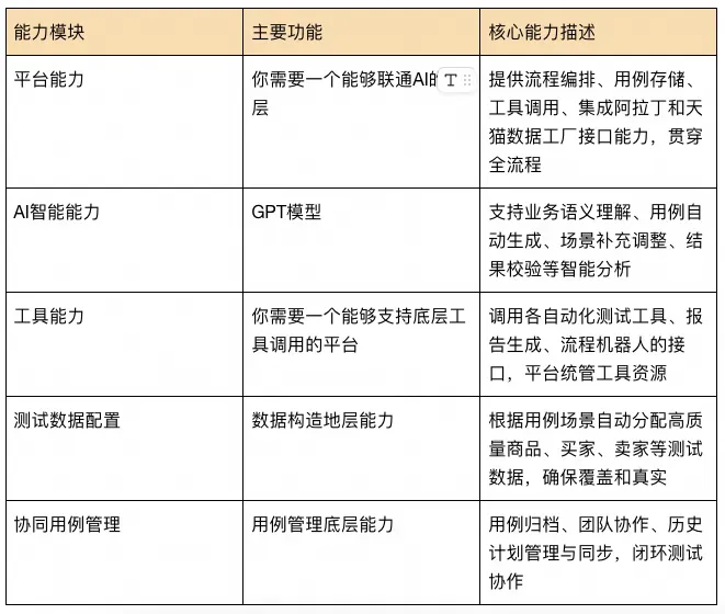 在AI时代天猫技术质量同学在质量保障方面也不断探索AI在测试全流程提效的落地方案,传统测试工作链条拆解为“需求解析 → 用例生成 → 数据构造 → 执行验证 → 对比校验”五大核心阶段,而我们的目标是通过AI+自然语言驱动,实现全流程自动化、可溯化、可管理化。而最AI参与到测试中来,最主要的目标就是提效,目前几个月的实践下来发现在用例生成、测试数据构造和交易链路数据执行的过程中提效明显,下面来给大家简单介绍一下AI参与在测试流程中的实践方案。